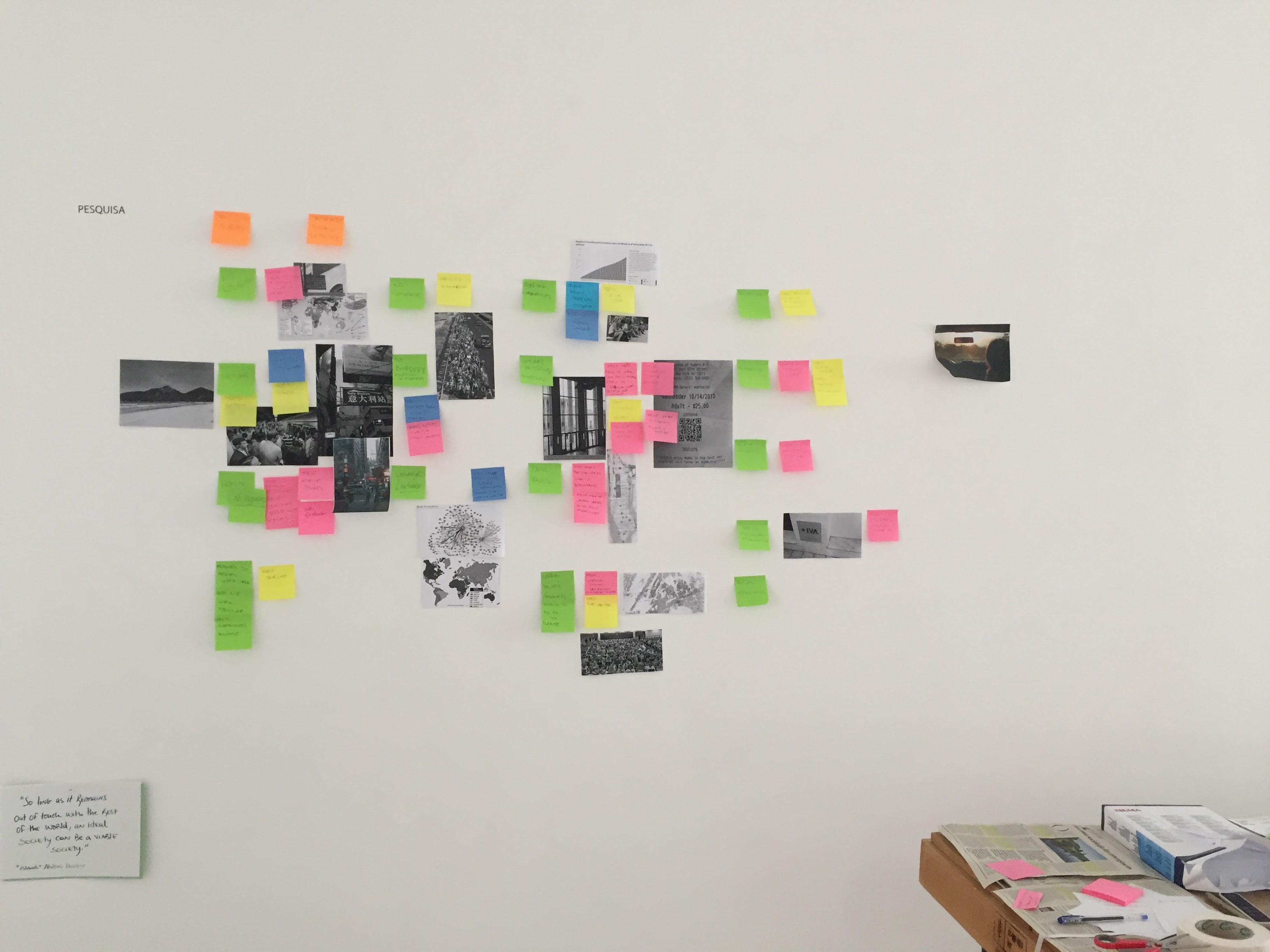 On our research wall in the gallery Filipa and I have begun to display the brainstorm of our ideas for the contrasts of the major items people are asking for in their utopias. I wanted to share with you some experimentations of using these images/ideas as contrasts in comparison to the utopias. I’m only posting photos here (no videos, yet). These images are just the very beginning of the visual representation of this initial idea, but we’re hoping to share more with you at the closing in August.
